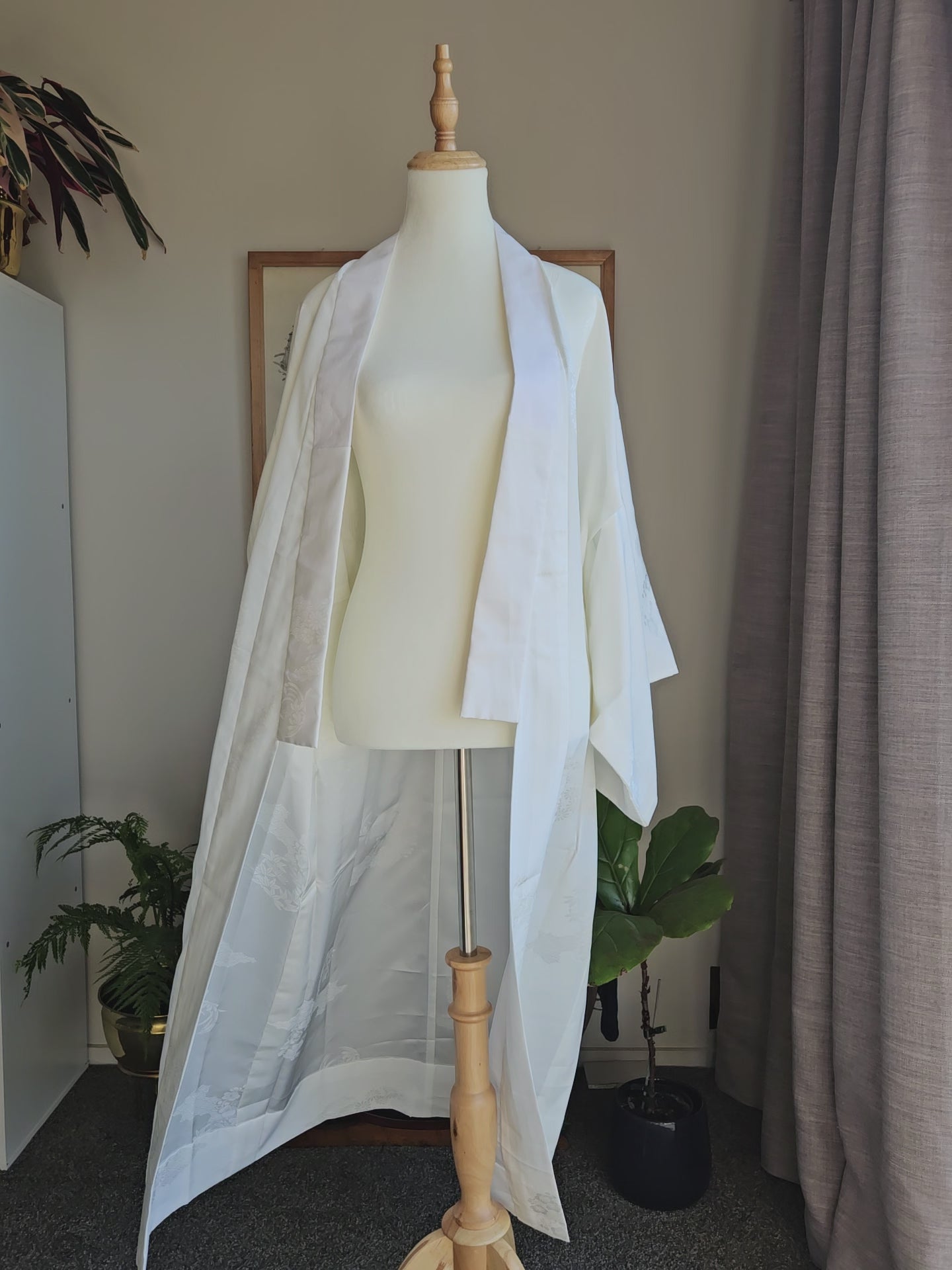 Size 8-10 womens ankle length Vintage under Kimono (Nagajuban). Cream with white collar. Covered in cherry blossoms, daisies and new bamboo shoots.